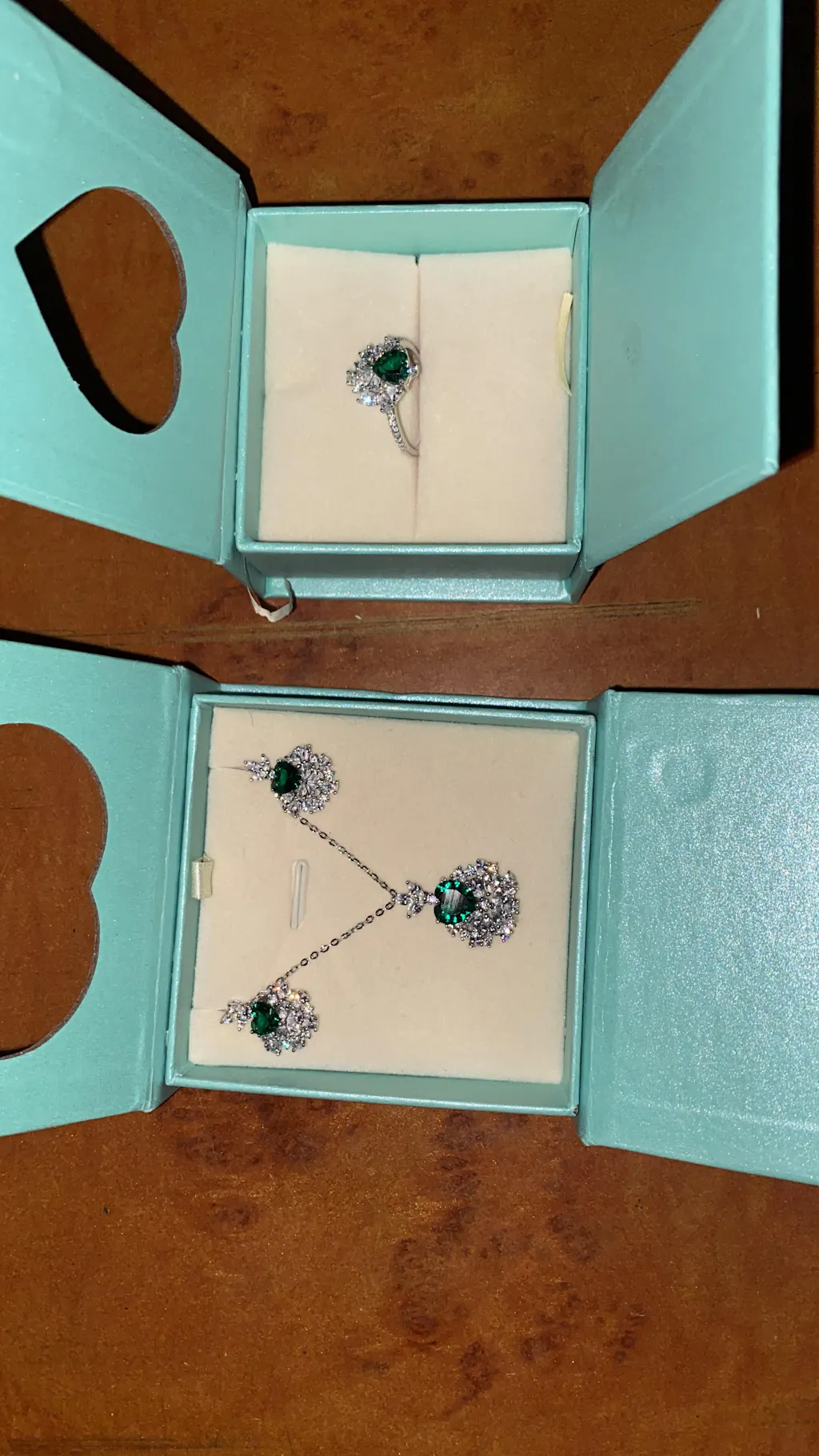 The 'Emerald Heart' Pendant Set radiate enchanting allure with their timeless design. Each piece features a captivating heart-shaped emerald, symbolizing love and vitality. Set in lustrous silver, they exude sophistication and elegance, adding a touch of glamour to any ensemble. A timeless expression of affection and beauty.